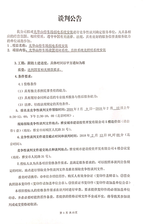 關(guān)于光華山停車場(chǎng)弱電系統(tǒng)安裝進(jìn)行競(jìng)爭(zhēng)性談判確定服務(wù)單位的邀請(qǐng)函