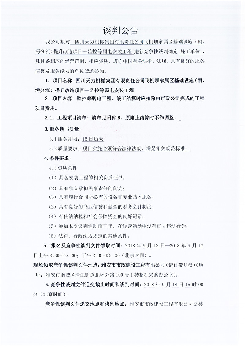 四川天力機械集團有限責任公司飛機壩家屬區(qū)基礎設施(雨、污分流)提升改造項目——監(jiān)控等弱電安裝工程(競爭性談判公告)