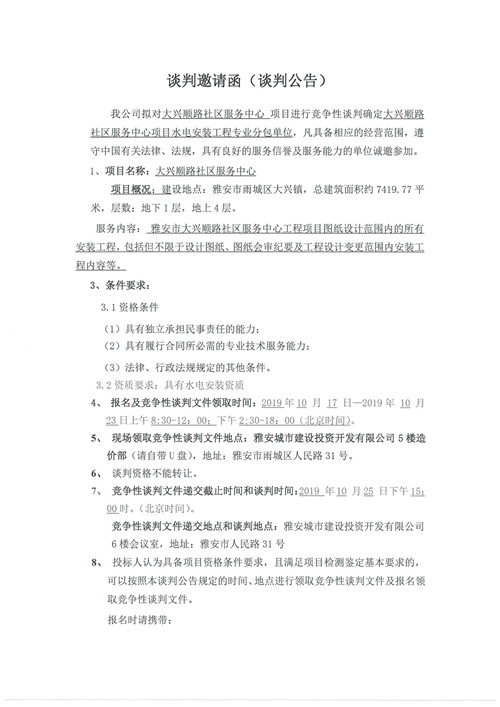 大興順路社區(qū)服務中心項目水電安裝工程專業(yè)分包單位競爭性談判公告