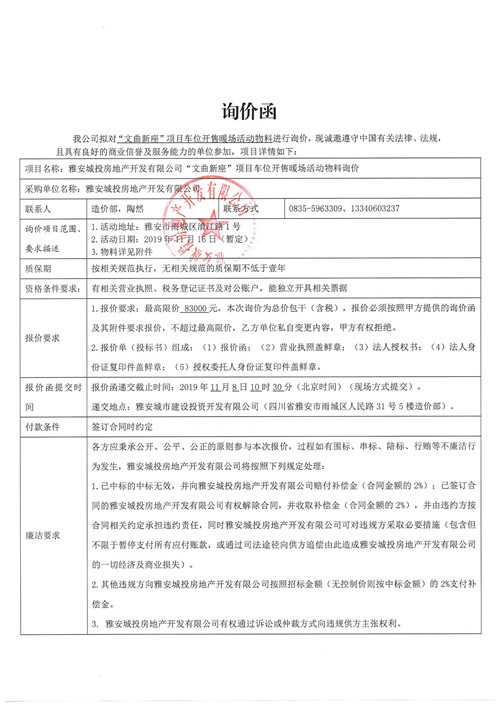 雅安城投房地產(chǎn)開發(fā)有限公司“文曲新座”項(xiàng)目車位開售暖場(chǎng)活動(dòng)物料詢價(jià)函(第二次)