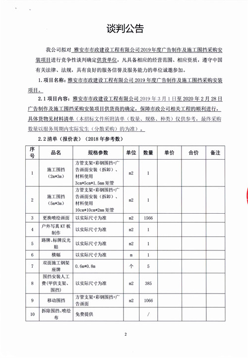 市政公司2019年度廣告制作及施工圍擋采購安裝項目競爭性談判公告