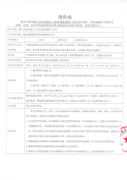 雅安城利水電開發(fā)有限責任公司禁門關電站編寫《水庫調(diào)度規(guī)程》競爭性談判公告