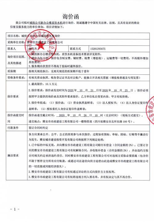 城投公司新辦公樓直飲水機詢價函