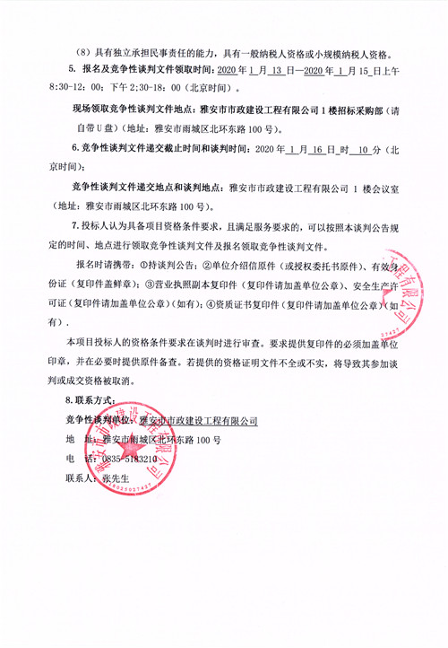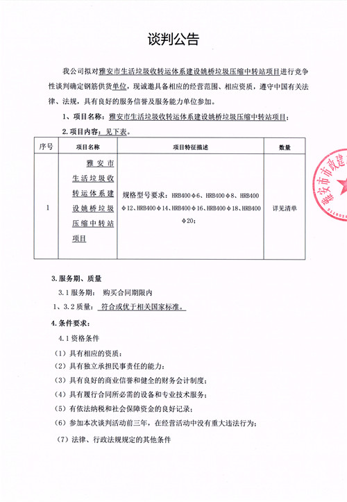 雅安市生活垃圾轉運體系建設姚橋垃圾壓縮中轉站項目確定鋼筋供貨單位的競爭性談判公告