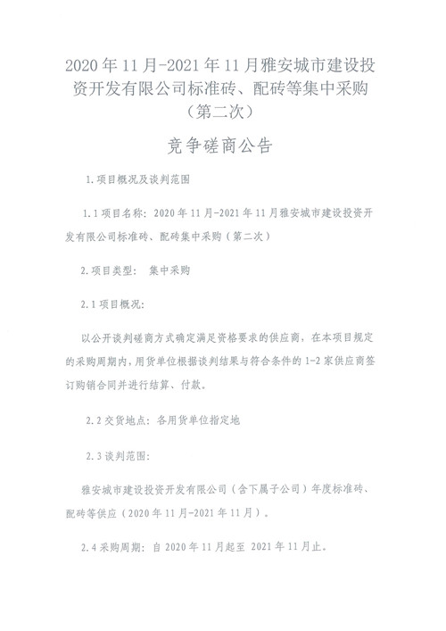 2020年11月-2021年11月雅安城市建設(shè)投資開發(fā)有限公司標(biāo)準(zhǔn)磚、配磚等集中采購(第二次)競爭磋商公告