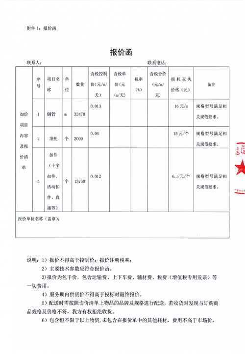 市政公司西康記憶建設(shè)項(xiàng)目鋼管、扣件詢價(jià)函