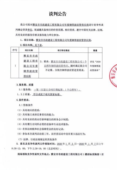 雅安市市政建設(shè)工程有限公司年度鋼帶波紋管供應(yīng)商競爭性談判公告