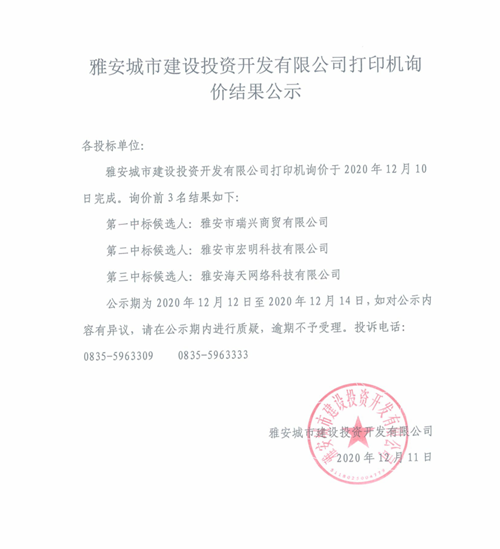 雅安城市建設(shè)投資開(kāi)發(fā)有限公司打印機(jī)詢價(jià)結(jié)果公示