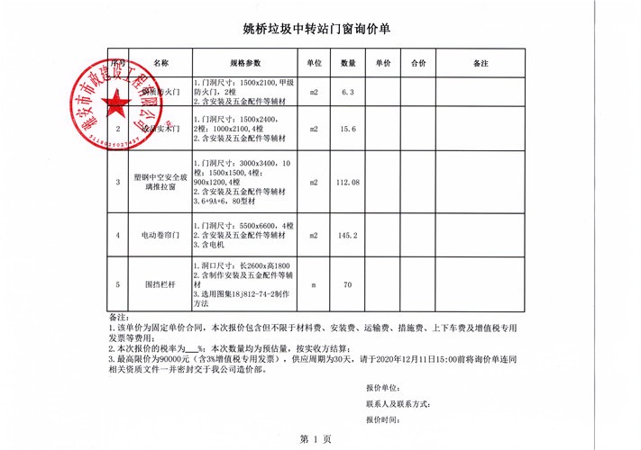 市政公司姚橋垃圾中轉(zhuǎn)站門窗詢價單