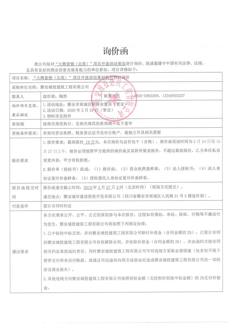 “大興壹號(北苑)”項(xiàng)目開盤活動策劃詢價(jià)函
