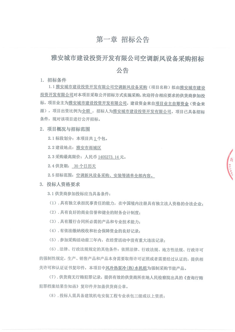 雅安城市建設投資開發(fā)有限公司空調新風設備采購招標公告