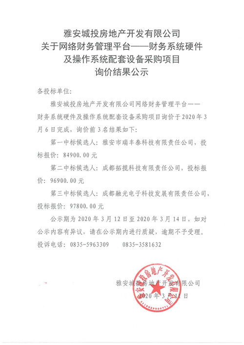 城投房地產(chǎn)公司關(guān)于網(wǎng)絡(luò)財(cái)務(wù)管理平臺(tái)——財(cái)務(wù)系統(tǒng)硬件及操作系統(tǒng)配套設(shè)備采購(gòu)項(xiàng)目詢價(jià)結(jié)果公示