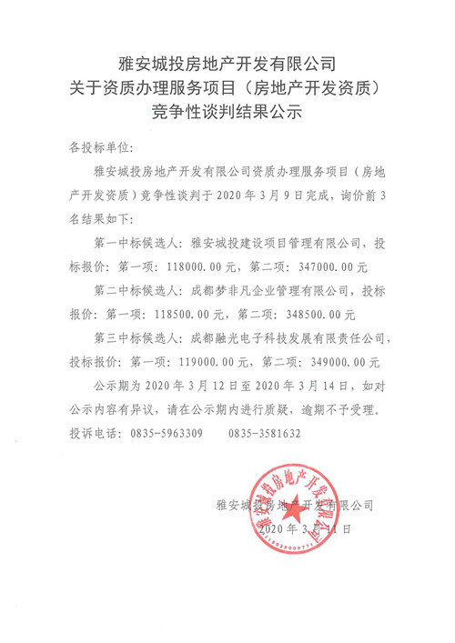 城投地產(chǎn)公司關(guān)于資質(zhì)辦理服務(wù)項目(房地產(chǎn)開發(fā)資質(zhì))競爭性談判結(jié)果公示