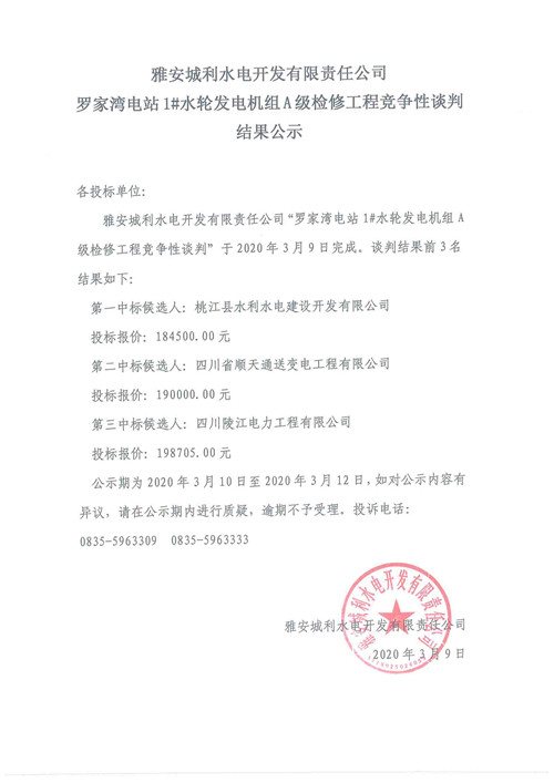 羅家灣電站1#水輪發(fā)電機(jī)組A級檢修工程競爭性談判結(jié)果公示