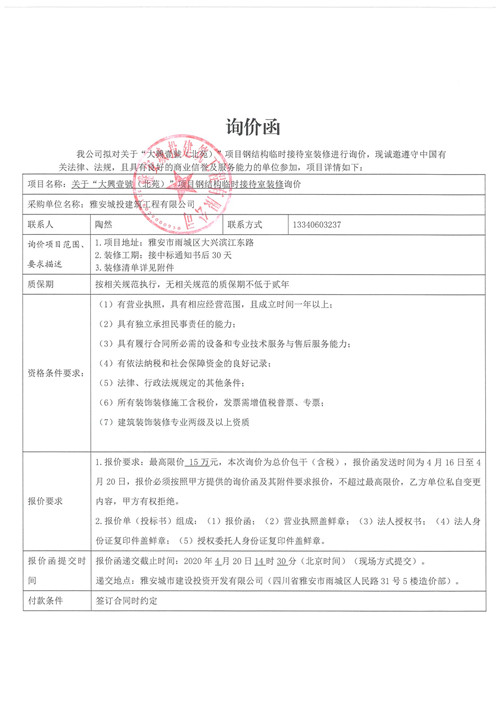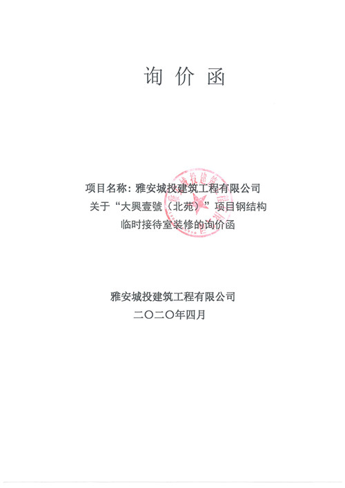 城投建工“大興壹號(hào)(北苑)”項(xiàng)目鋼結(jié)構(gòu)臨時(shí)接待室裝修的詢價(jià)函