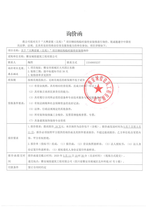 大興壹號項目鋼結構臨時接待中心裝飾裝修詢價函