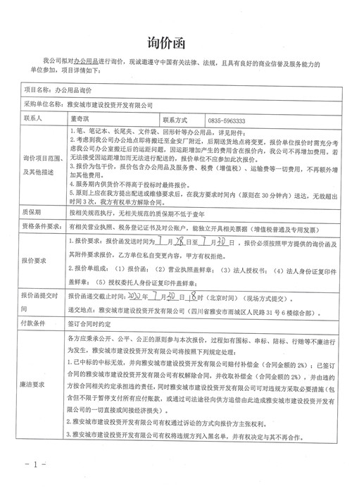 雅安城市建設(shè)投資開發(fā)有限公司辦公用品詢價