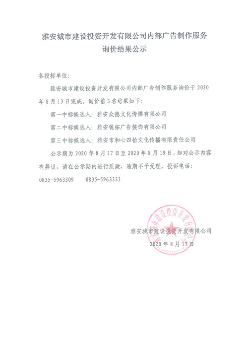 雅安城市建設投資開發(fā)有限公司公司內(nèi)部廣告制作服務詢價結(jié)果公示