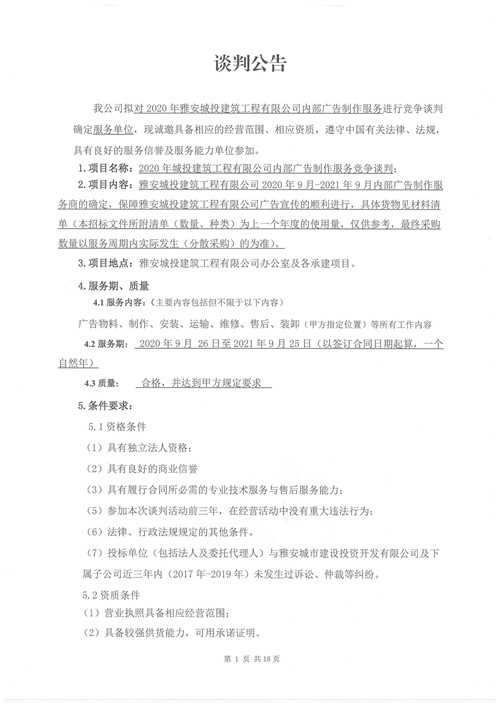 2020年雅安城投建筑工程有限公司內(nèi)部廣告制作服務競爭性談判公告