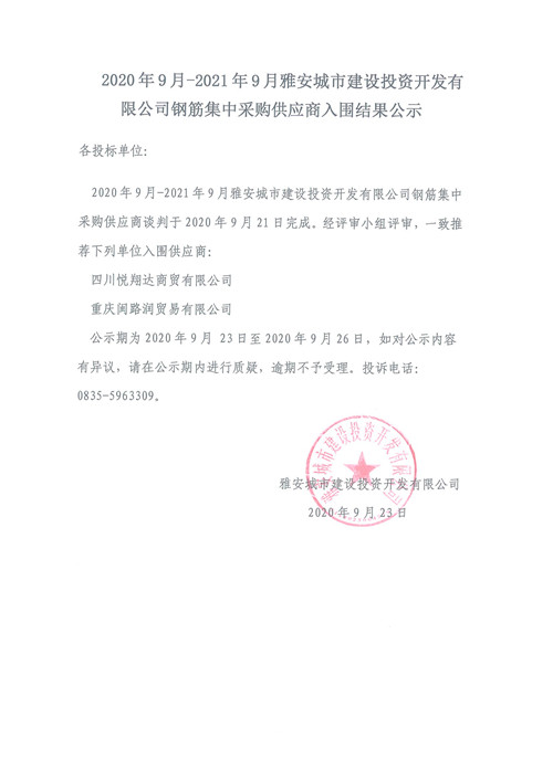 2020年9月-2021年9月雅安城市建設(shè)投資開發(fā)有限公司鋼筋集中采購供應(yīng)商入圍結(jié)果公示