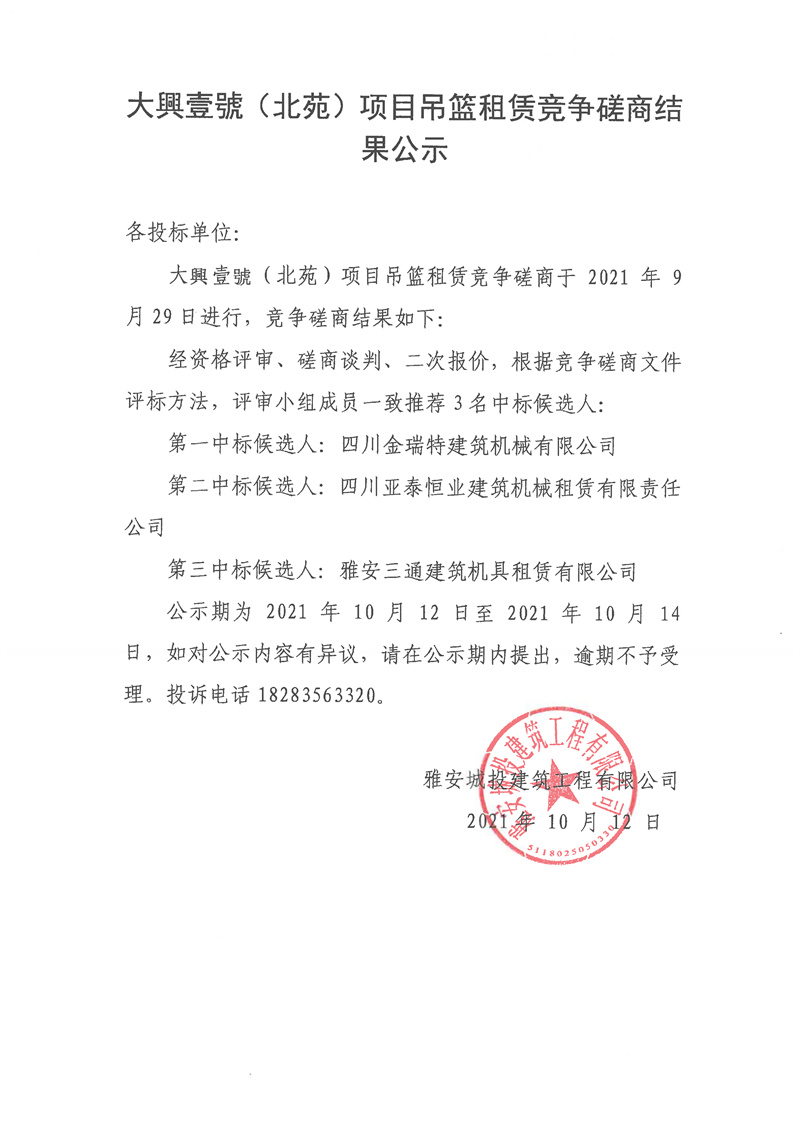 大興壹號(hào)(北苑)項(xiàng)目吊籃租賃競(jìng)爭(zhēng)性磋商(第二次)結(jié)果公告