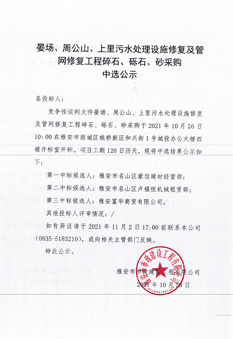 晏場(chǎng)、周公山、上里污水處理設(shè)施修復(fù)及管網(wǎng)修復(fù)工程碎石、礫石、砂采購(gòu)中選公示