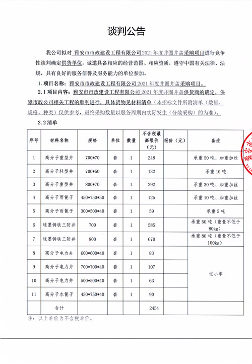 雅安市市政建設(shè)工程有限公司2021年井圈井蓋采購(gòu)項(xiàng)目競(jìng)爭(zhēng)性談判公告