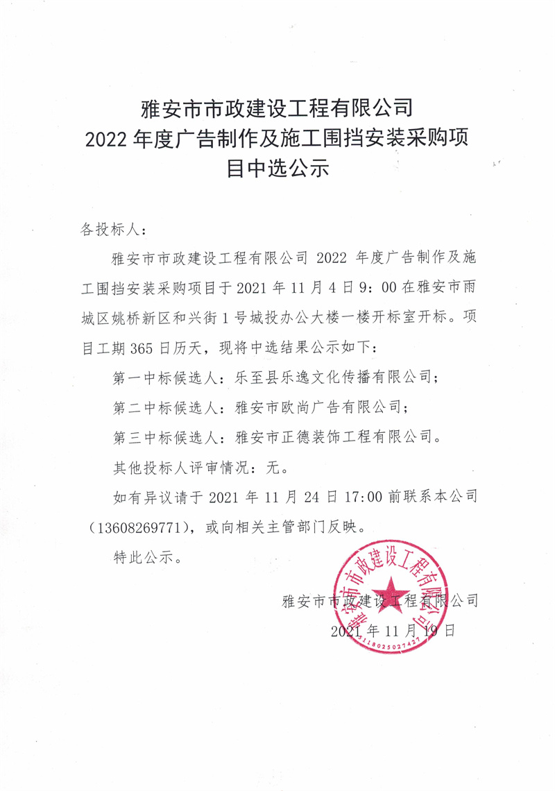 雅安市市政建設(shè)工程有限公司2022年度廣告制作及施工圍擋安裝采購(gòu)項(xiàng)目中選公示