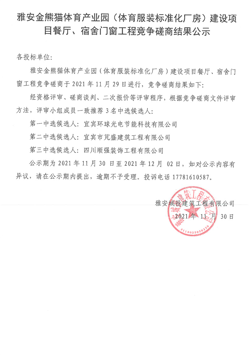 雅安金熊貓體育產(chǎn)業(yè)園(體育服裝標準化廠房)建設項目餐廳、宿舍門窗工程競爭磋商結果公示