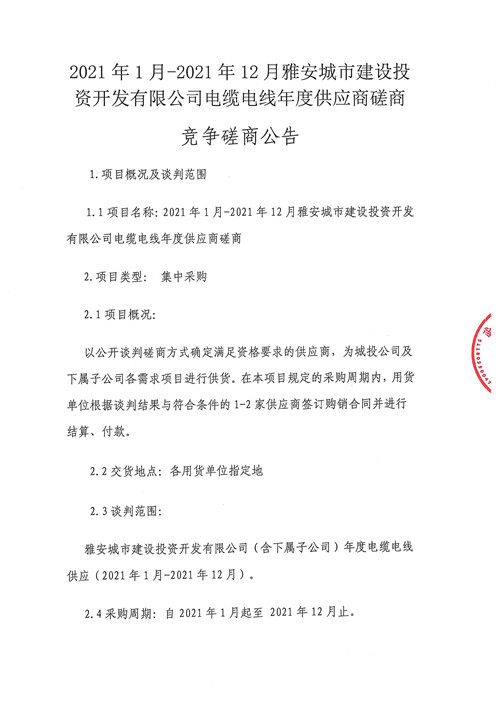 2021年1月-2021年12月雅安城市建設(shè)投資開發(fā)有限公司電纜電線年度供應(yīng)商磋商競(jìng)爭(zhēng)磋商公告
