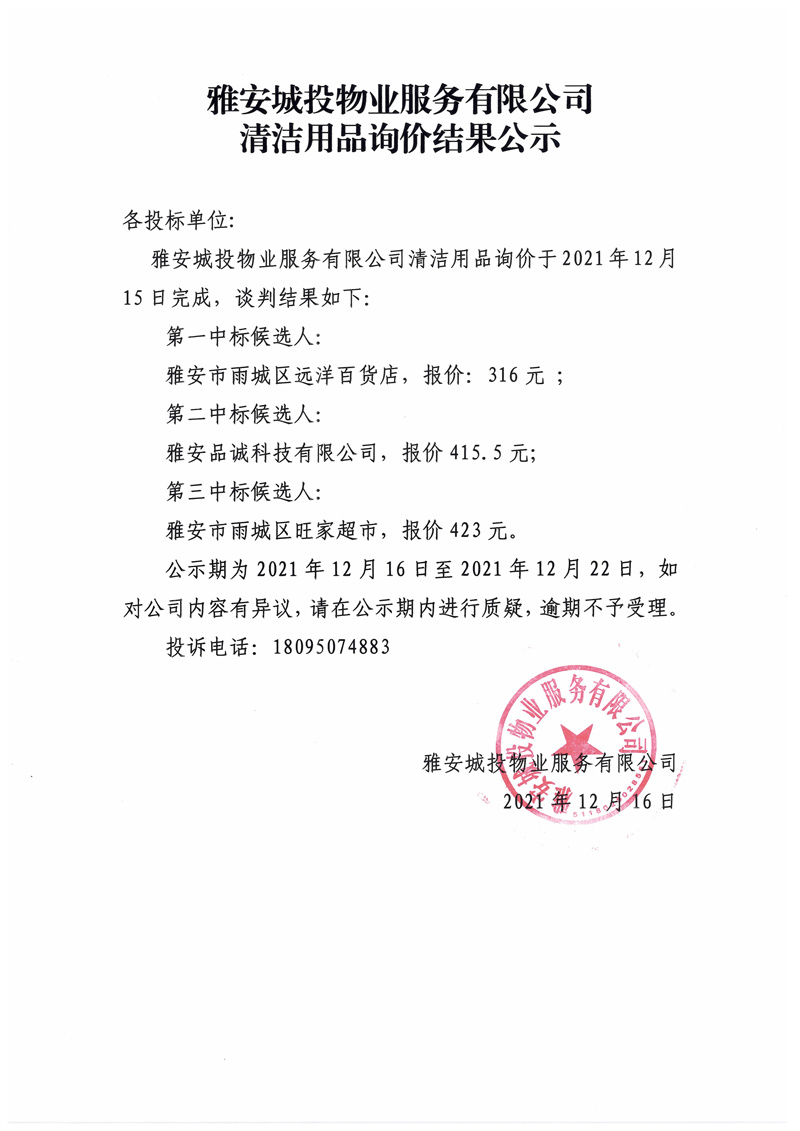 雅安城投物業(yè)服務(wù)有限公司清潔用品詢價(jià)結(jié)果公示