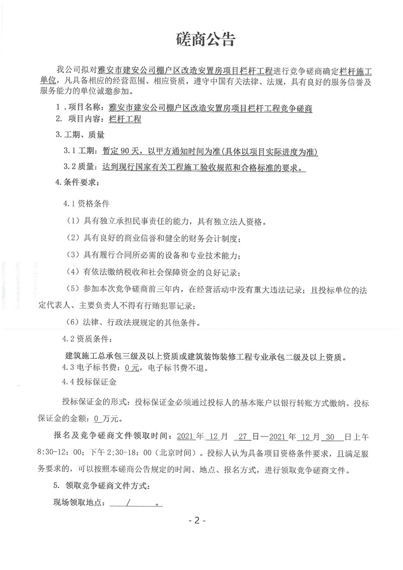 雅安市建安公司棚戶區(qū)改造安置房項目欄桿工程競爭磋商公告