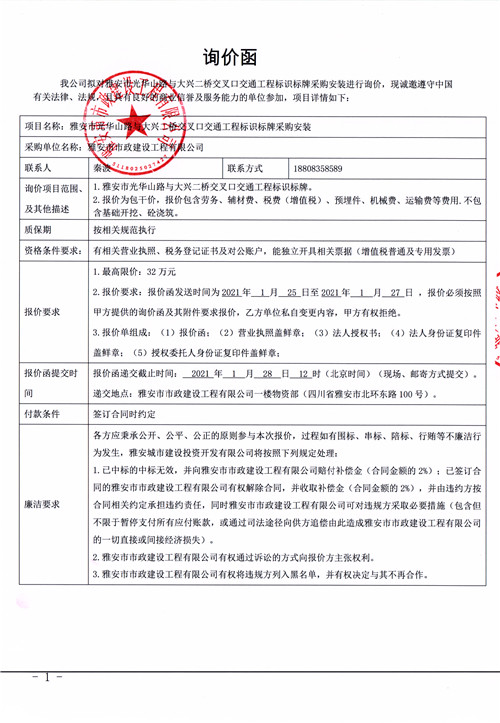 雅安市市政建設(shè)工程有限公司雅安市光華山路與大興二橋交叉口交通工程標識標牌采購安裝詢價函
