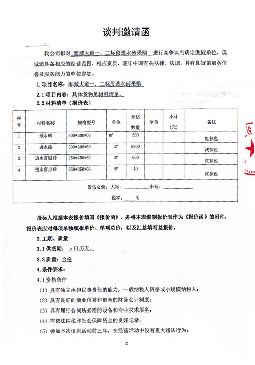 市政公司雨城大道一、二標段透水磚采購競爭性談判公告