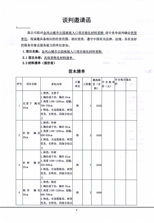 金鳳山城市公園南坡入口項(xiàng)目綠化材料采購談判邀請(qǐng)函