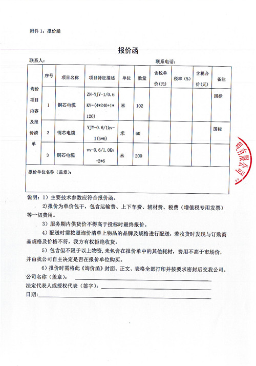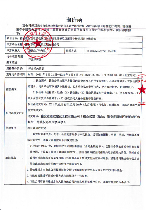 雅安市生活垃圾收轉(zhuǎn)運體系建設姚橋垃圾壓縮中轉(zhuǎn)站項目電纜采購詢價函
