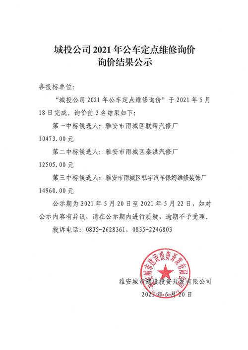 城投公司2021年公車定點維修詢價詢價結(jié)果公示