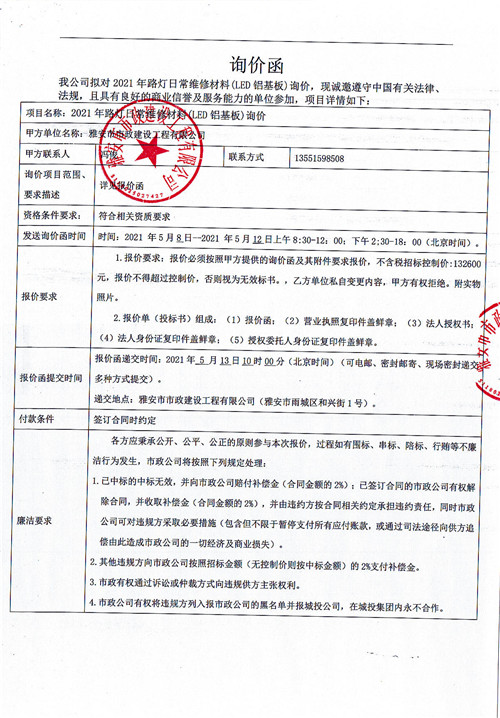 2021年路燈日常維修材料(LED鋁基板)詢價(jià)函