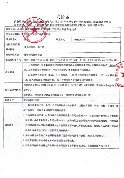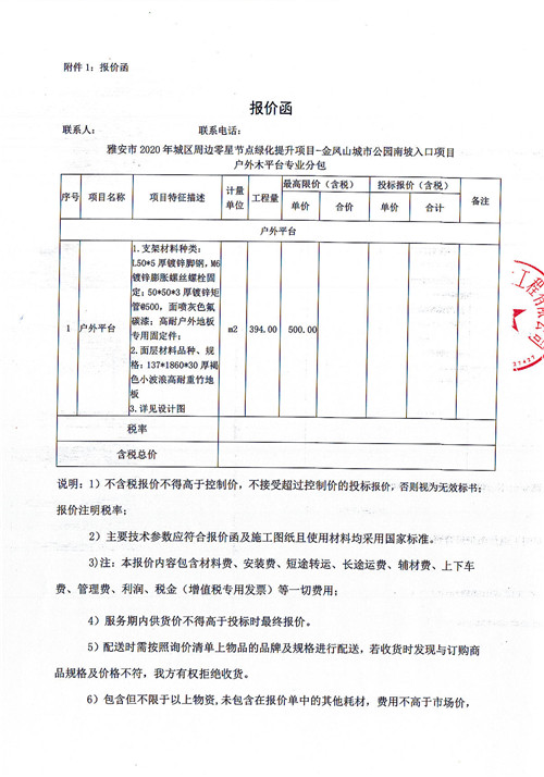 雅安市政公司金鳳山城市公園南坡入口項目-戶外平臺專業(yè)分包詢價函