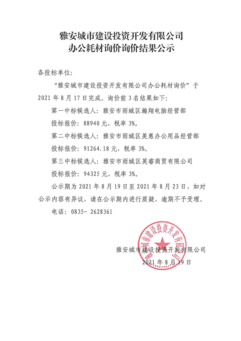 城投公司辦公耗材詢價結(jié)果公示