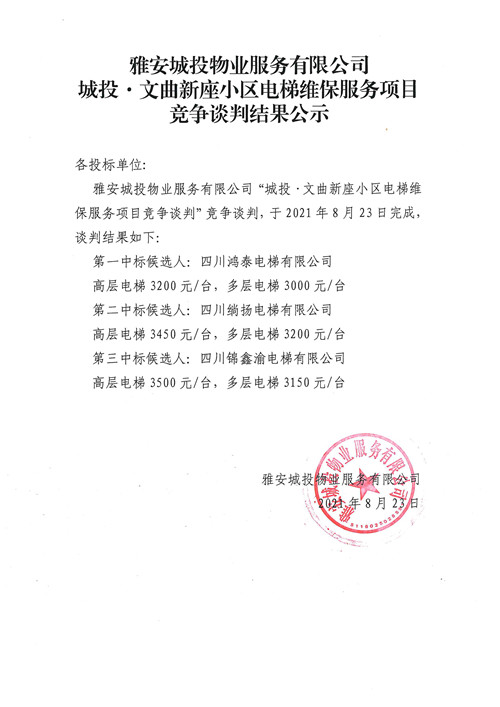 城投物業(yè)公司城投·文曲新座小區(qū)電梯維保服務(wù)項目競爭談判結(jié)果公示