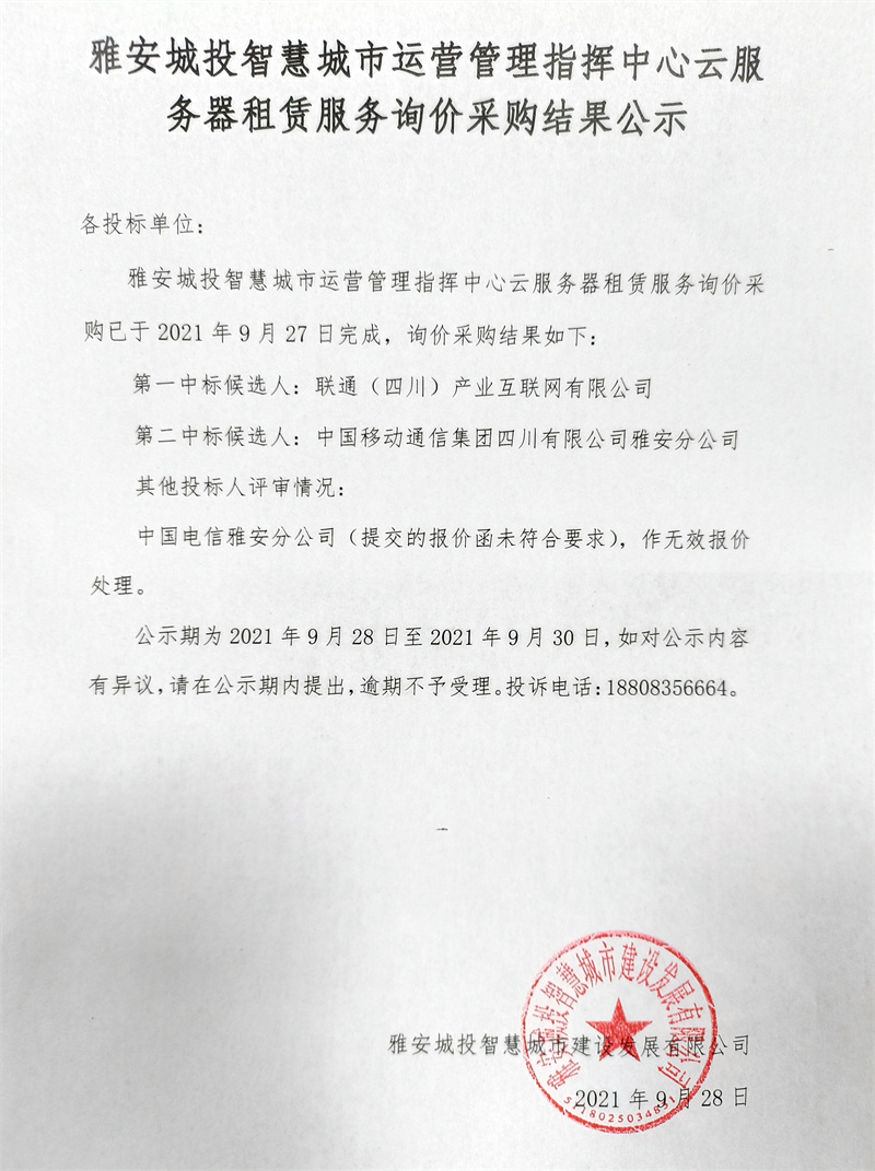 雅安城投智慧城市運營管理指揮中心云服務(wù)器租賃服務(wù)采購詢價結(jié)果公示