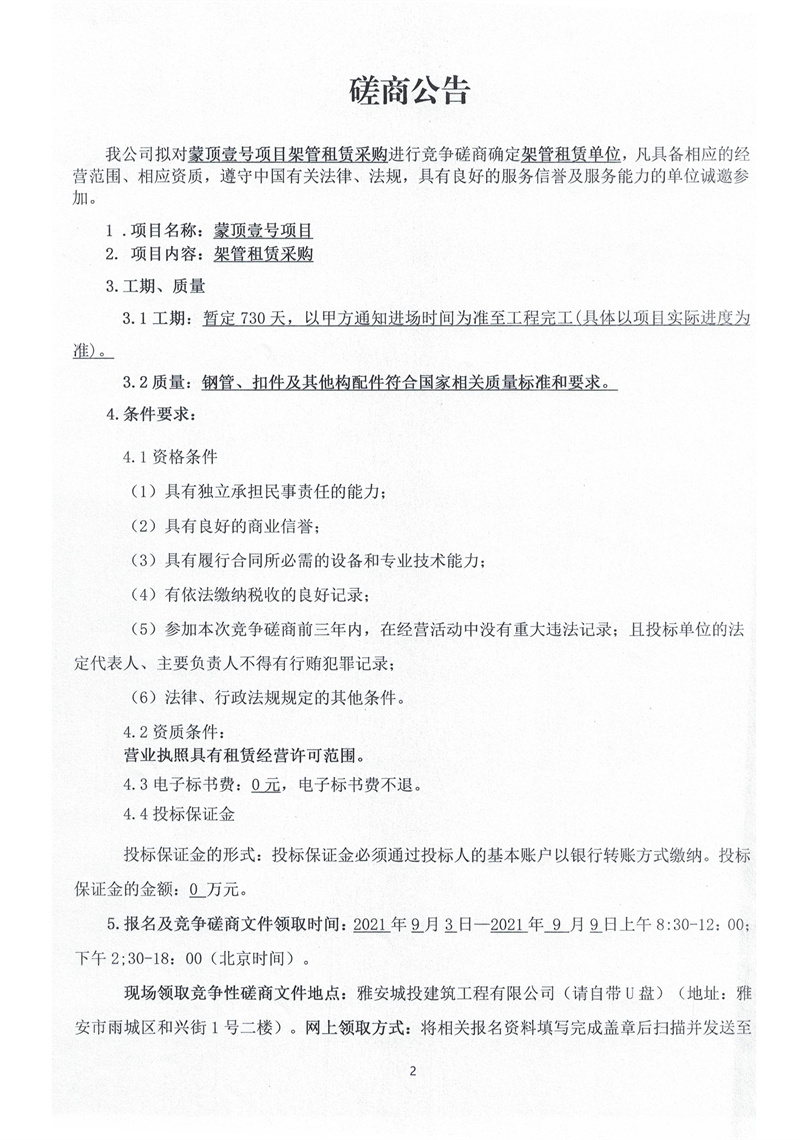 蒙頂壹號項(xiàng)目架管租賃采購競爭磋商公告
