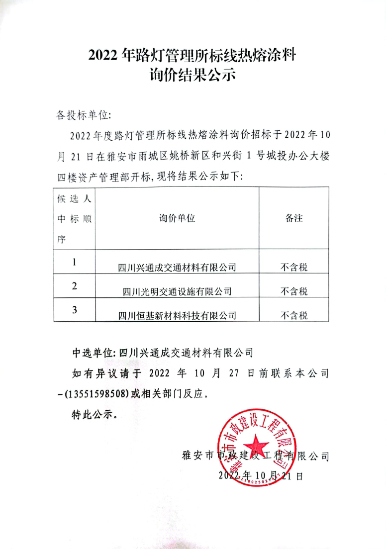 2022年路燈管理所標(biāo)線熱熔涂料詢價(jià)結(jié)果公示