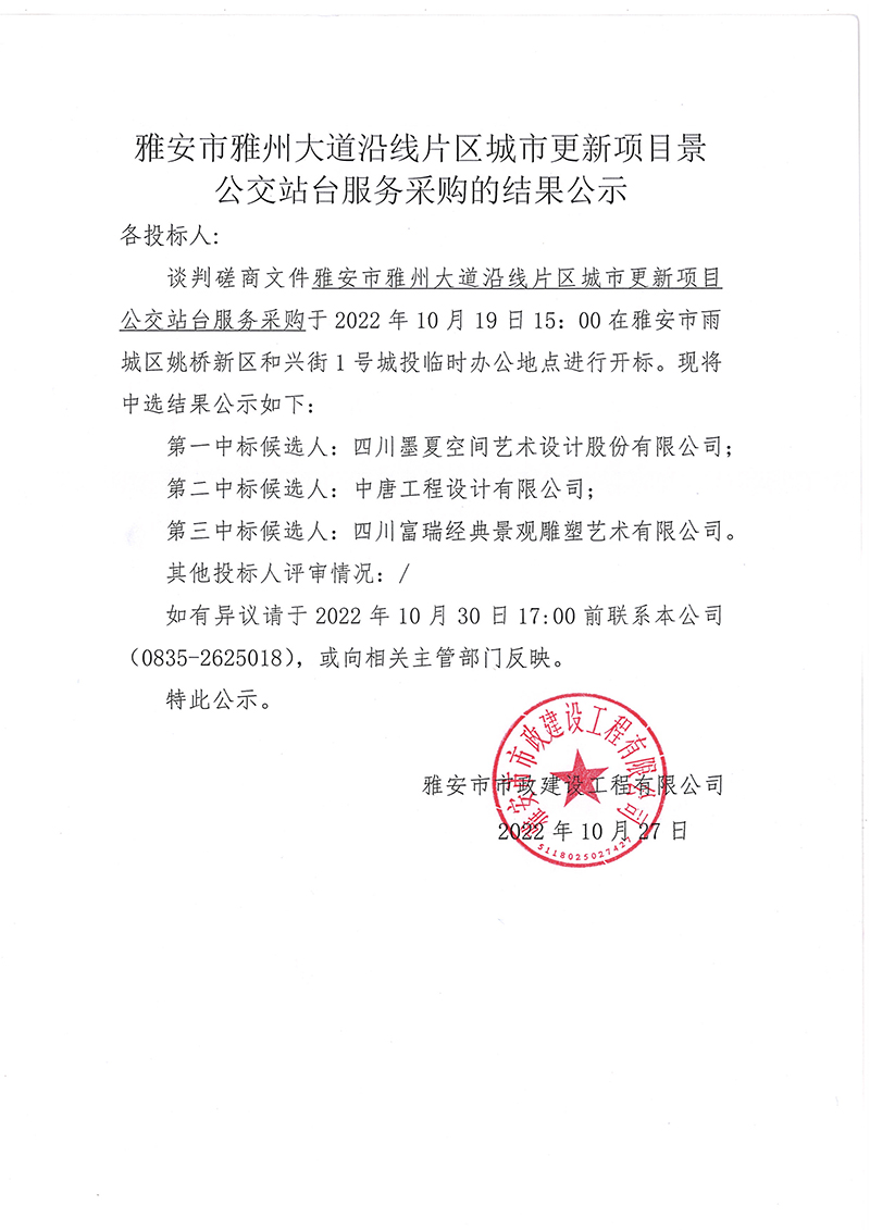 雅安市雅州大道沿線片區(qū)城市更新項目景觀公交站臺服務(wù)采購的結(jié)果公示