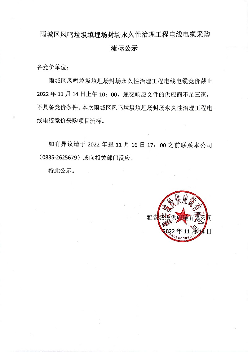 雨城區(qū)鳳鳴垃圾填埋場封場永久性治理工程電線電纜采購流標公示