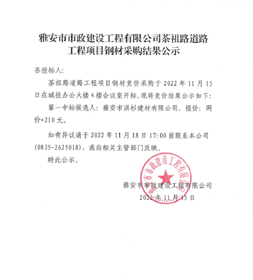 雅安市市政建設(shè)工程有限公司茶祖路道路工程項(xiàng)目鋼材采購(gòu)結(jié)果公示
