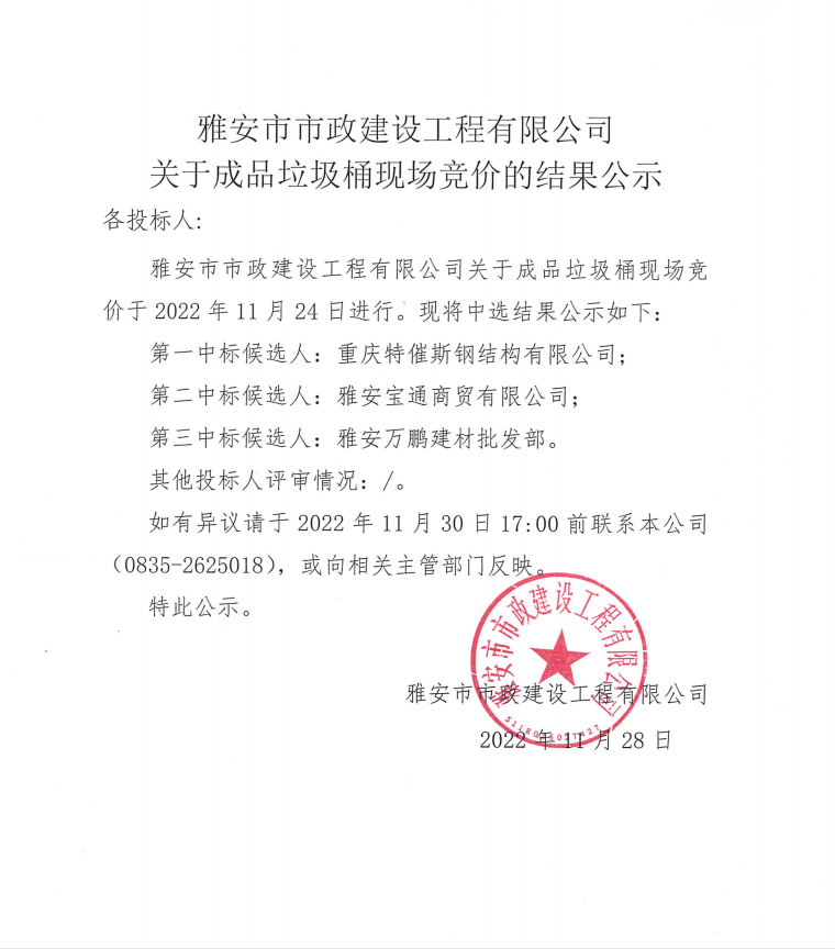 雅安市市政建設工程有限公司關(guān)于成品垃圾桶現(xiàn)場競價的結(jié)果公示