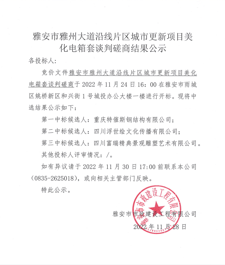 雅安市雅州大道沿線片區(qū)城市更新項目美化電箱套談判磋商結(jié)果公示