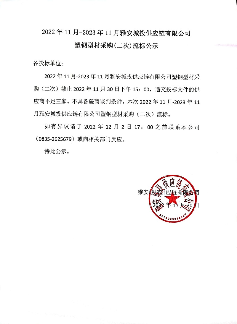 2022年11月-2023年11月雅安城投供應(yīng)鏈有限公司塑鋼型材采購(gòu)(二次)流標(biāo)公示